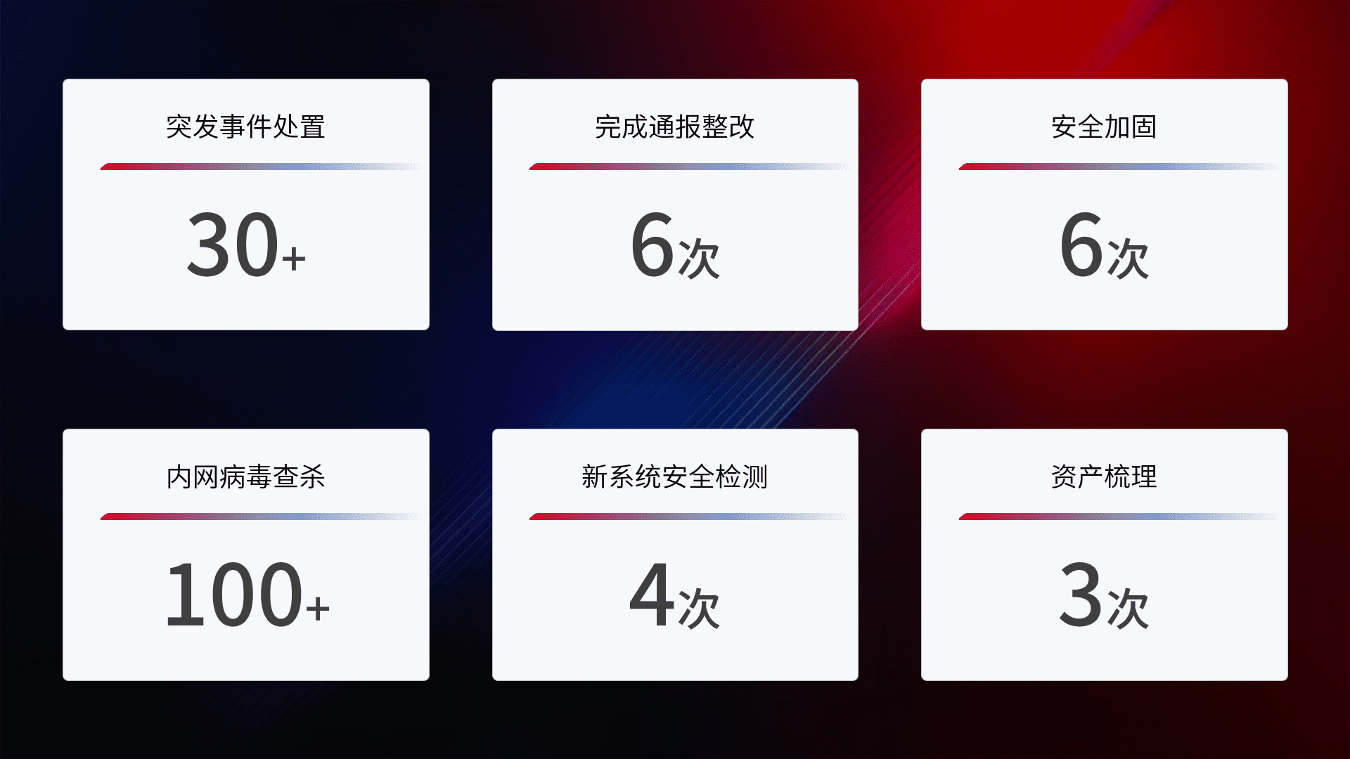 网络安全加固与风险管理:通过技术加固手段,,如加强区域隔离,,,,缩减攻击内网横向移动的范围;优化现有网络安全管理制度,,,,降低网络威胁暴露面,,,减少被黑客攻击的可能性。。