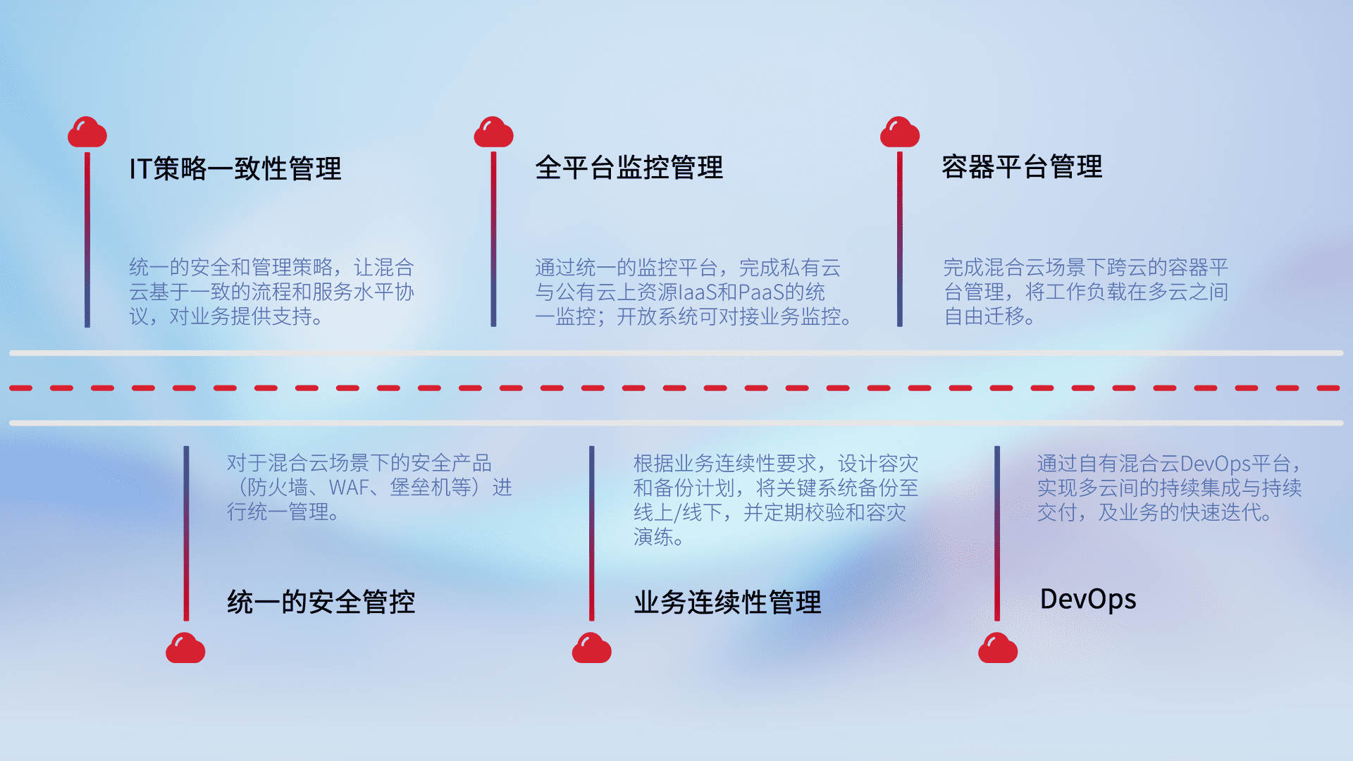 通过多云纳管,,以统一的资源数据模型把客户的云资源进行抽象和封装,,进而实现对多云资源的统一操作,,,,保障云资源管理的可靠性、、稳定性与可用性。。。量身定制化运维内容,,,配置、、、、开发运维、、补丁管理、、、备份、、、、监控、、、、认证和访问管理、、、、审计和日常巡检等,,,保障在用云过程中的可靠度,,稳定度以及高可用率。。。