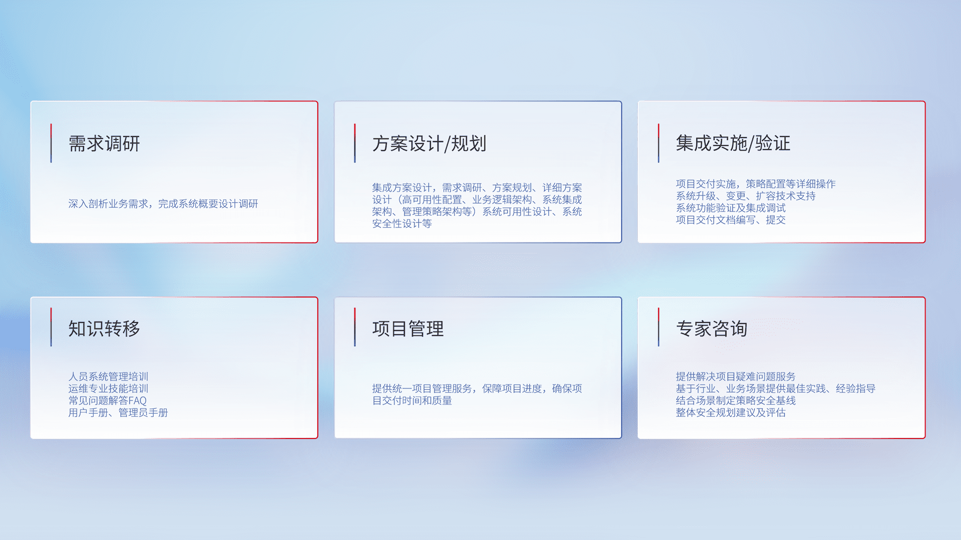 针对客户行业特性,,,,将宏观的安全战略和需求,,,,通过专业的交付服务,,,实现项目落地,,,为客户提供标准规范的集成交付服务。。。
